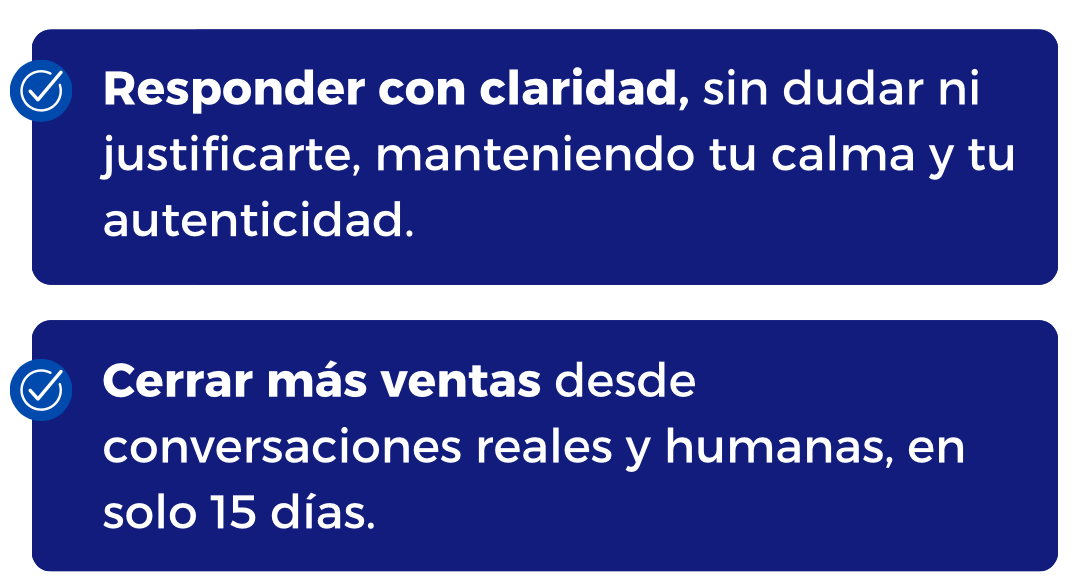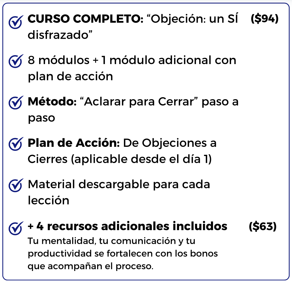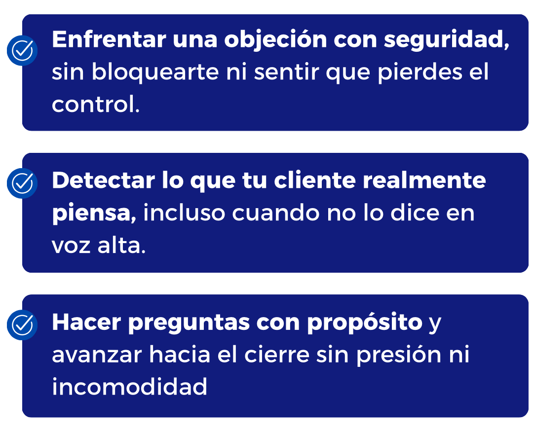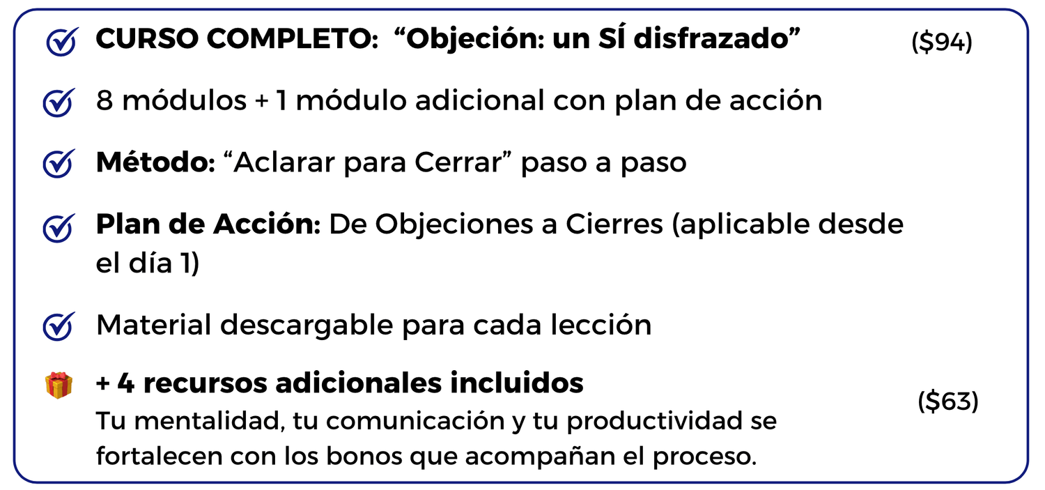 Este curso te ayuda a responder objeciones con confianza, mantener el control de tus conversaciones y cerrar con más seguridad.