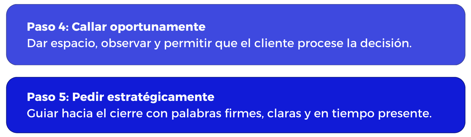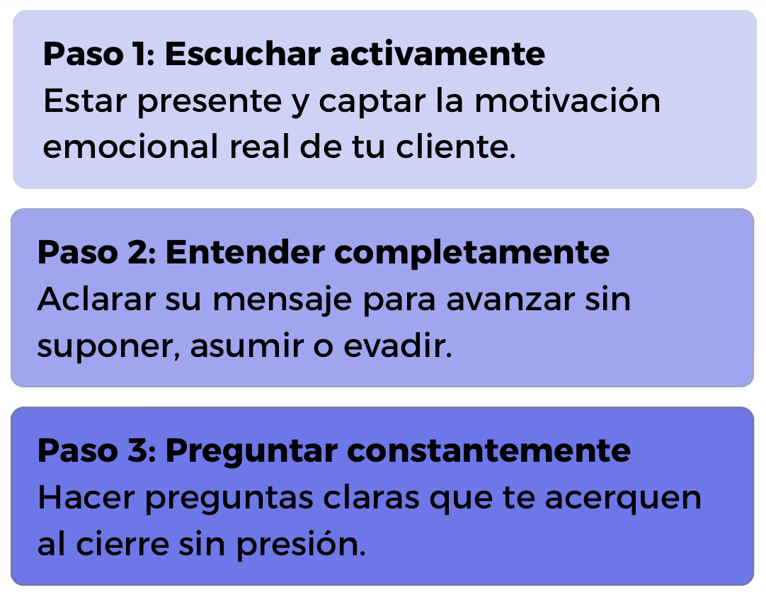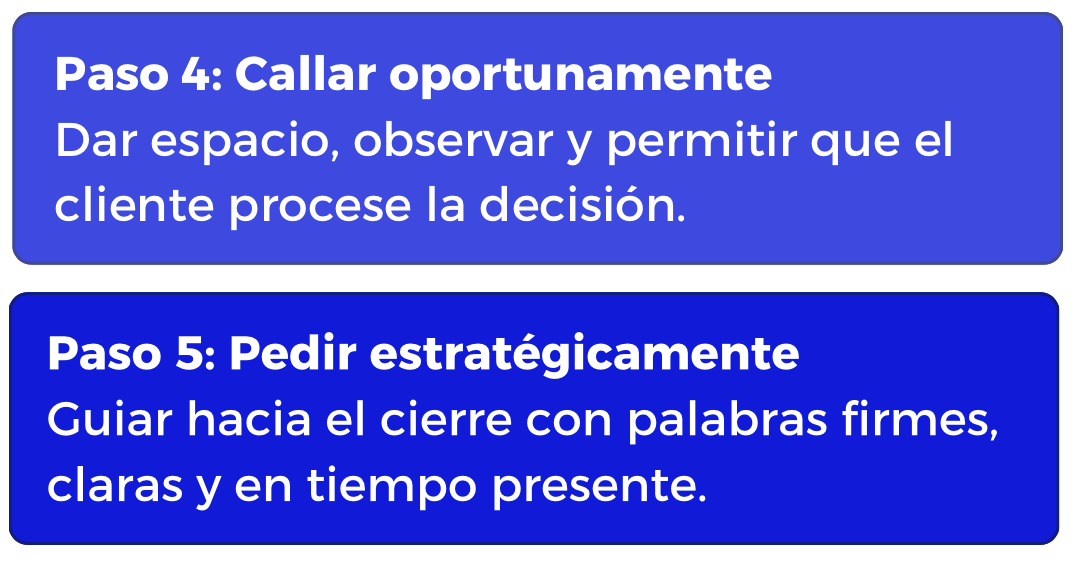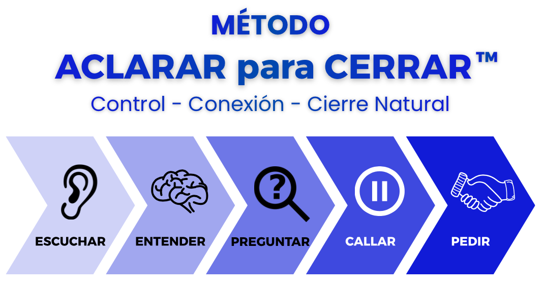 Un proceso simple de cinco pasos que te permite sentirte en control, escuchar de verdad y llevar cada conversación hacia un cierre natural.