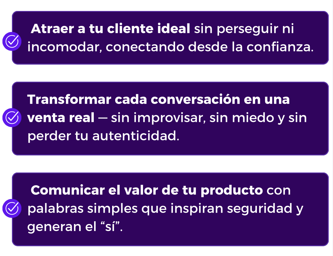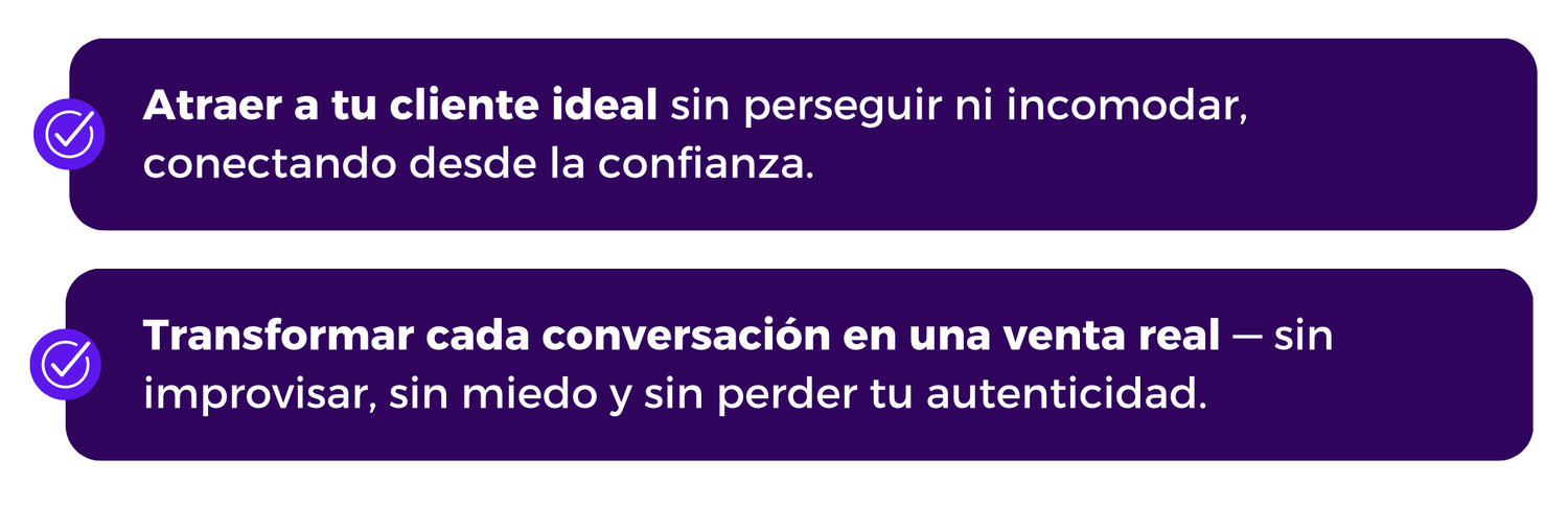 Imagina poder hablar de tu oferta con naturalidad, sentirte tranquilo al vender y atraer personas que confían en ti porque sienten tu autenticidad.