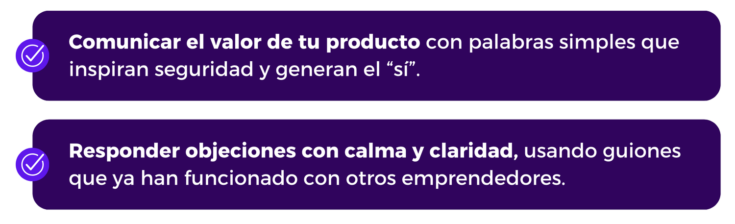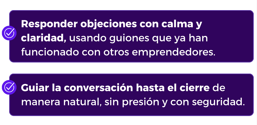 Habla con seguridad, responde objeciones sin miedo y vende con confianza, incluso si estás empezando.