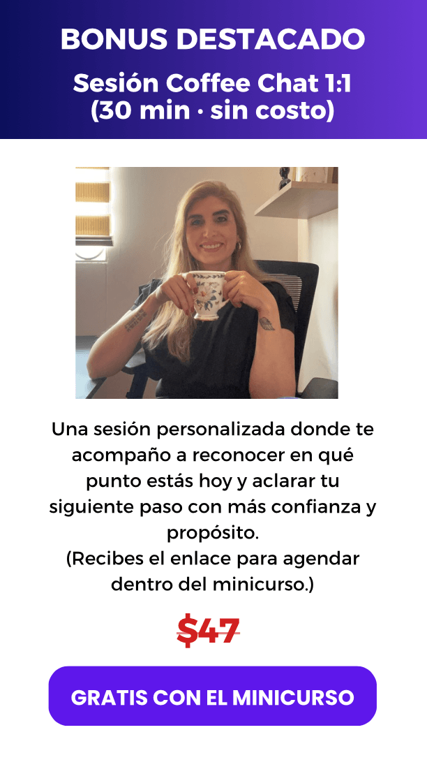 Sí. El minicurso incluye una Sesión Coffee Chat 1:1 (30 min sin costo) para reconocer en qué punto estás hoy y aclarar tu siguiente paso con más confianza y propósito.