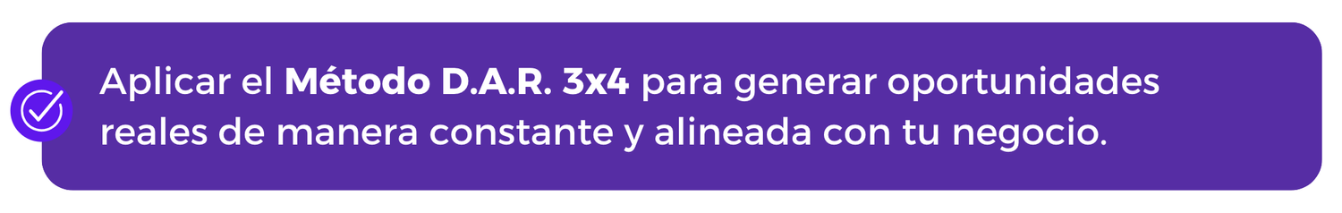 Aprende a dejar de perseguir clientes y a crear un flujo más ordenado de oportunidades, con el Método D.A.R. 3x4: un sistema simple para prospectar con claridad, coherencia y sin sentir que presionas.